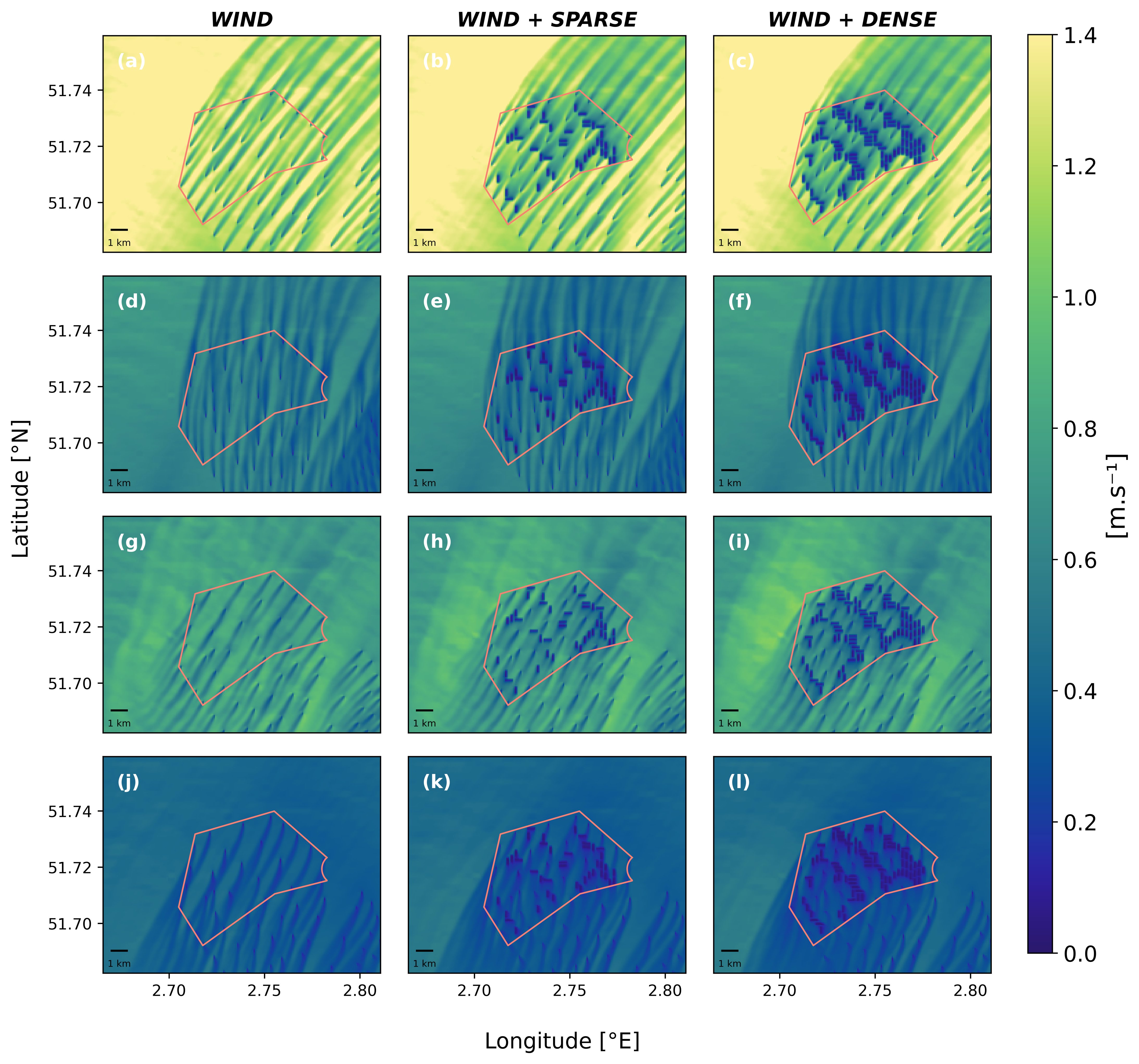 Surface current speed for different tidal moments and scenarios. Left: reference scenario with only offshore wind turbines (‘WIND’). Centre: scenario with wind turbines + FPV (‘WIND + SPARSE’). Right: scenario with wind turbines + FPV (‘WIND + DENSE’). (a–c) surface current speed at high tide (HT). (d–f) HT + 3 hours. (g–i) HT + 6 hours. (j–l) HT + 9 hours. The moment of the highest tide (HT) was selected using the surface elevation at the center of the domain i.e. 1.7 m of elevation on 15/01. Orange contours indicate the Mermaid wind farm concession area. This is Figure 4 in the paper.